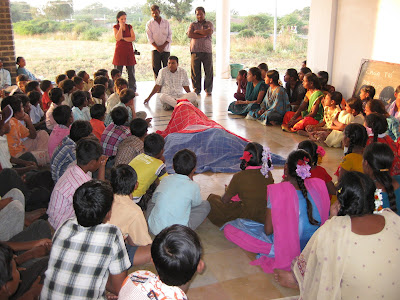 En Shourie explica la importància de que els nens i les nenes vinguin a les classes de repàs. Ara estan en l’últim trimestre del curs i s’han d’esforçar per passar de curs. També explica que els pares han de portar les notes de l’escola, justificants i rebuts de matrícula perquè Haribala es faci càrrec dels estudis dels nens i nenes.