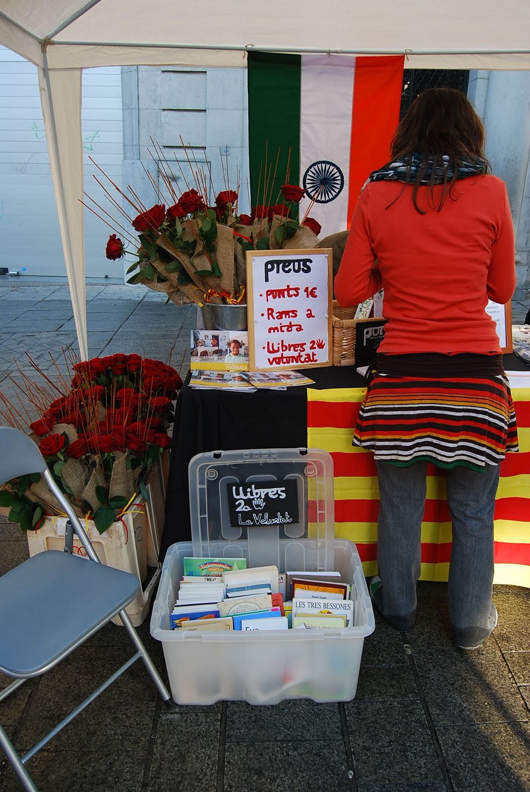 Por segundo año, Haribala tampoco se ha perdido la Diada de Sant Jordi celebrada en Mataró! Este año la parada tenía espacio para leer-disfrutar-de los libros de 2Mano. También regalaban gratis txay (típico te de la India) para todos los clientes que compraran una rosa o simplemente se quisieran sentar a ojear uno de los libros que teniamos de 2 mano, ya fuera para intercanviar o escoger alguno a cambio de la donación que quisieran. Este año como el anterior hemos podido vender todas las Rosas, así como algunos puntos de libros que Jordi, el diseñador de nuestra ong, creo para la ocasión.