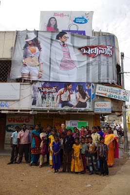 I per si no en tenien prou… els voluntaris que hi ha ara al centre (la Montse, la Núria i l’Ivan) van invitar els nens al cinema. Per a molts d’ells era la primera vegada. Van aprofitar l’estrena d’una pel·lícula que tothom en parlava molt bé, Badrinath, on el protagonista és un actor molt famós (Allu Arjun) i és clar, els nens sabien totes les seves cançons abans de començar la pel·lícula i tot.