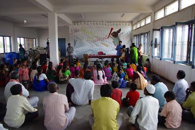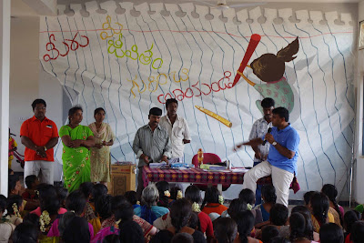 El día 10 de junio se presentaron los primeros niños que han entrado a vivir en el centro y se firmaron los acuerdos con los familiares. También estaba programada una reunión con todos los padres de los niños y niñas apadrinados pero tan sólo asistieron unas 160 personas. Durante la segunda reunión dos días más tarde, sí que asistieron casi todos los niños, niñas, chicos y chicas apadrinados, unos 200 en total. Prakash se encargó de la presentación junto con el resto del equipo (Arlappa, Pushpa, Latha i Sujatha). A parte del funcionamiento del centro, también se explicó la presencia de los voluntarios que han habido hasta el momento y los que llegarán durante los próximos meses. También se habló del compromiso que todos debían tener con los estudios y sus responsabilidades. Haribala los puede ayudar, pero ellos tendrán que esforzarse.