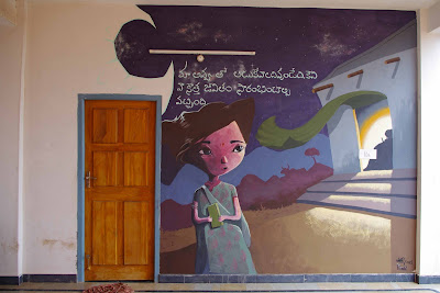 Desprès de dies entre esboços, dibuixos i pinzells l’equip del Bhanu Project ha acabat de pintar les parets del centre amb imatges de la història de la Bhanu. Ells són en Miquel, en Carles i l’Albert Penao, però a Koilakuntla els coneixen com el Michel, el Xa i el Penao, il·lustradors professionals que han omplert el centre de color i amb un toc personal.