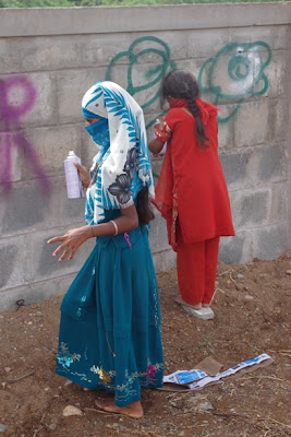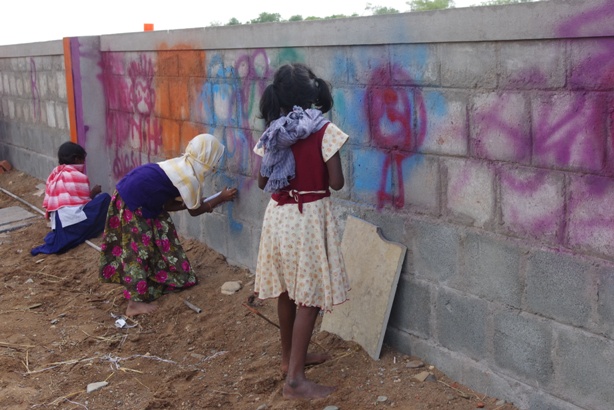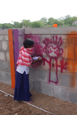 Haribala també vol omplir de color les parets del centre on viuran tots els nens. Primer van ser els il·lustradors, amb el Bhanu Project, i ara han estat els nens qui han demostrat la seva creativitat. Amb els materials que havien sobrat van pintar una part el mur que envolta el centre.