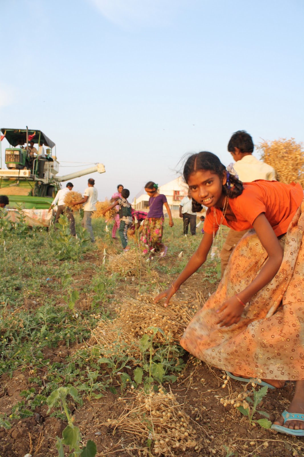 Un cop els treballadors van tenir tallades totes les plantes de cigrons i apilonades els nens i nenes del centre van voler ajudar a triar el gra de la palla, en 10 minuts ja teníem tot el camp passat per la màquina i ells ben feliços d’haver ajudat, ja que en època de collites normalment ajuden a les seves famílies en les collites als pobles.