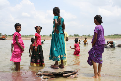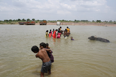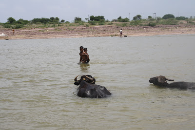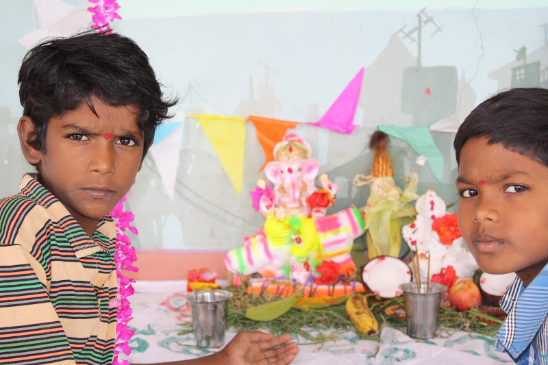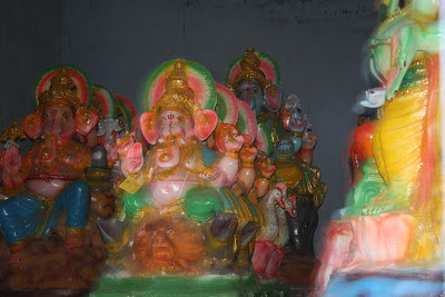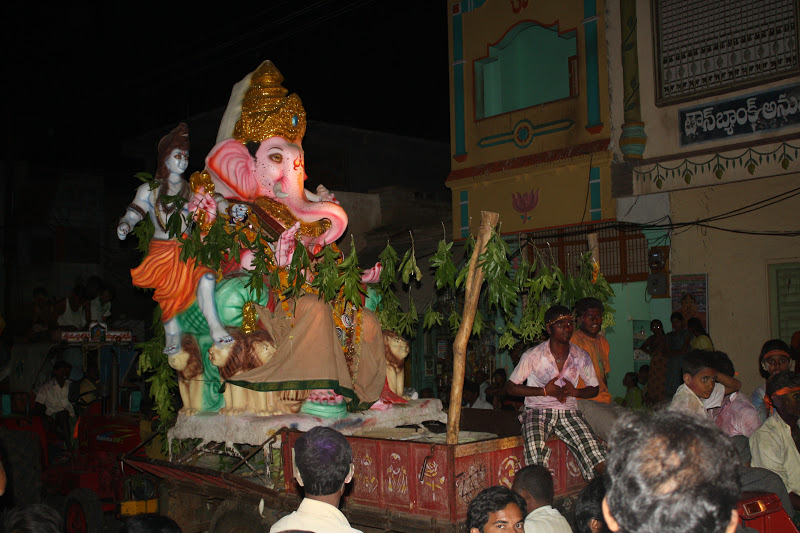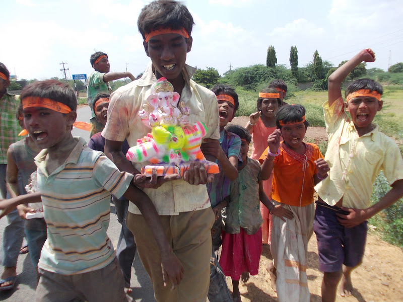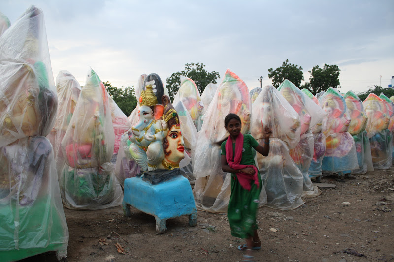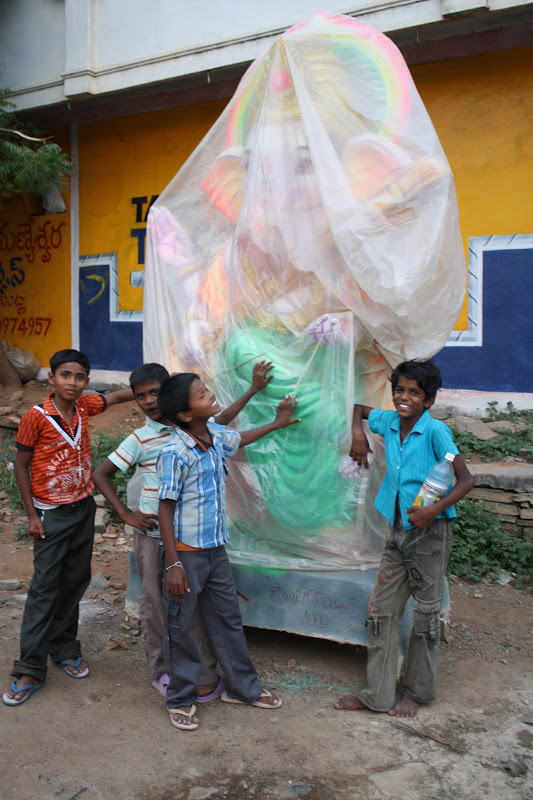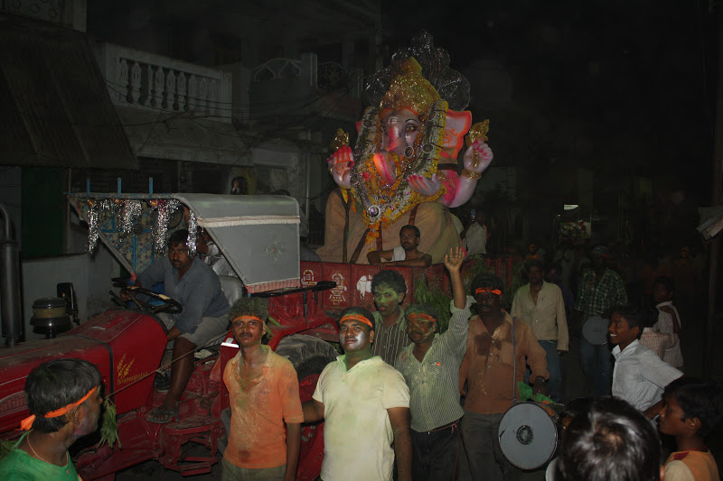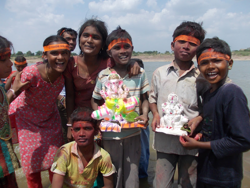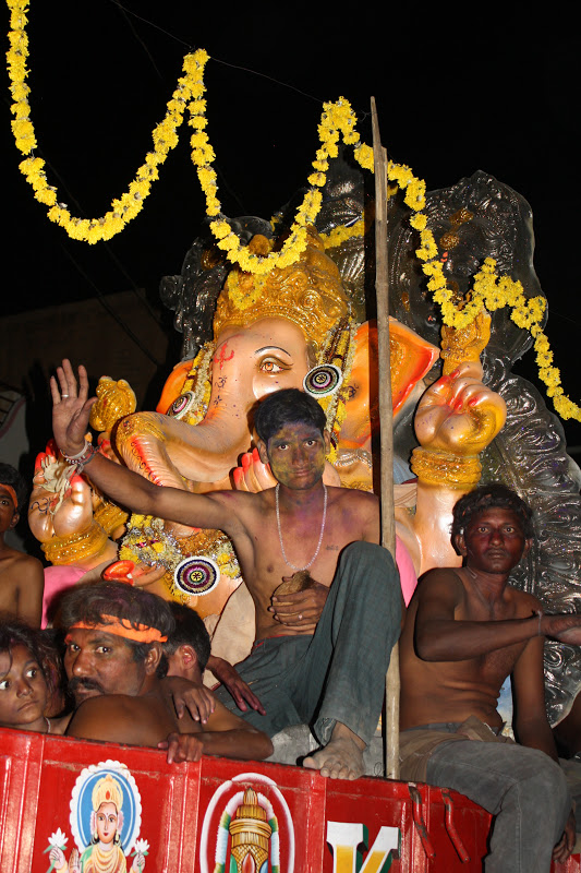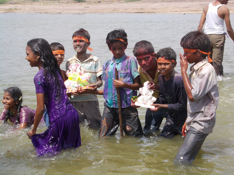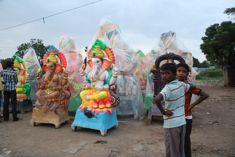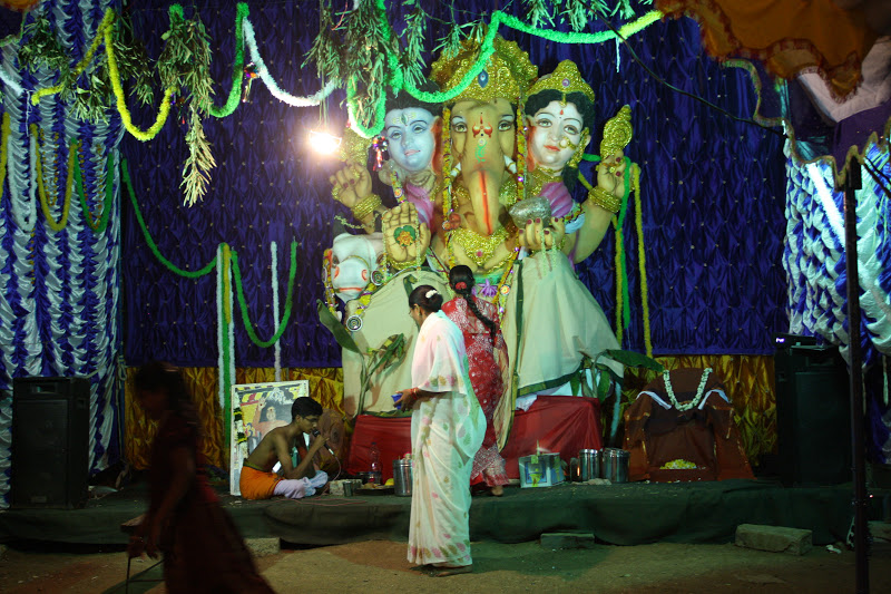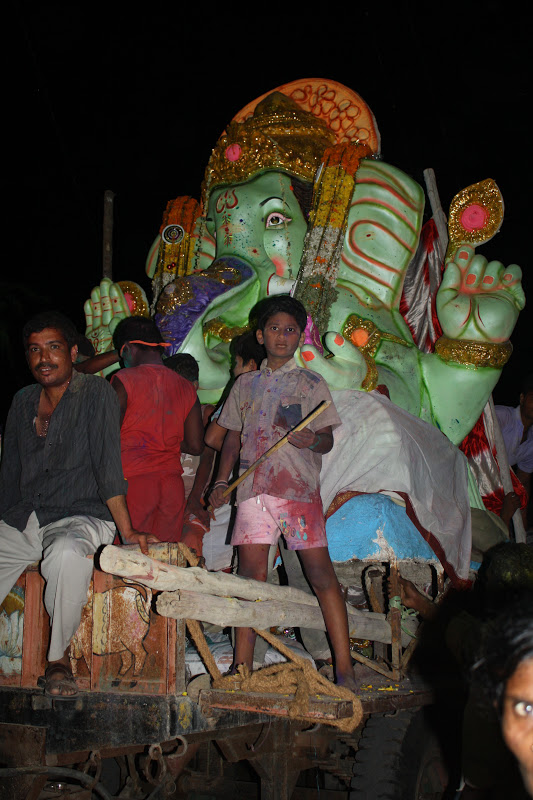 People from the neighborhood buy large Ganesha figures to make an offer , first they walk through the village and make color wars, after five days they lead to the river and throw the offering. The sculptures are made from plaster so when they throw them they melt and become part of the river.
