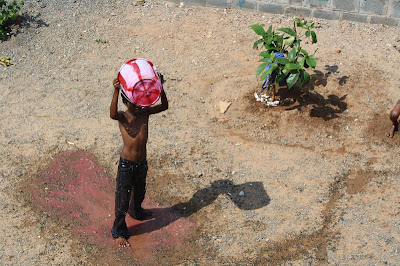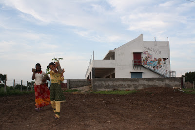 Seguint amb la plantació d’arbres, vam haver d’esperar a poder plantar els arbres fruiters al pati del darrera fins que no van haver posat el tancat perquè els búfals del poble no es mengessin els petits arbres….Al llarg del pati a banda i banda hem plantat els arbres fruiters que es regaran amb les aigües emmagatzemades en un tanc d’aigües pluvials, durant l’època de pluges. Són de 9 espècies diferents, per tenir varietat Durant tot l’any, moltes d’elles són autòctones de la zona desconegudes per nosaltres. Mango, Papaya, Coco, Plàtan, Llimes, Sapota, Jama, Danima, Sini-Batay. L’Ajuntament de Koilakuntla té un viver d’arbres que no són fruiters i ens ha donat 54 arbres que hem plantat al al final del pati. L’hi hem posat el nom de BOSC D’HARIBALA perquè tinguem ombra i els nens puguin posar els seus gronxadors, i lianes, i puguin jugar tranquil·lament sense haver de patir per el sol potent del migdia i tarda. Esperem que tots aquesta arbres creixin per donar ombra i fruites a tots els nens i nenes que viuran en el futur al centre d’acollida, i que en la mesura del possible reduïm sempre la nostra Petjada Ecològica. El Centre d’Acollida de Koilakuntla sempre intenta tenir el mínim impacte sobre el medi ambient, i és un tema que es parla amb els nens i nenes del centre; sobre la importància de no contaminar, de tractar els residus, de re-aprofitar les aigües, de plantar arbres i flors, de respectar l’entorn i els animals que hi viuen.