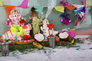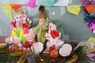 People from the neighborhood buy large Ganesha figures to make an offer , first they walk through the village and make color wars, after five days they lead to the river and throw the offering. The sculptures are made from plaster so when they throw them they melt and become part of the river.