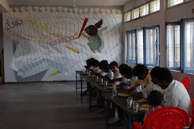 Once the works on the building are finished, next step is the blessing of the building as Hindu tradition stablishes. The ritual, called MEKA in Telgu, is an Hindu ceremony to bless the building and call on good luck. Men gather and kill a goat. With its blood they mark a hand on every wall of the upper part of the building. Afterwards, they make offerings with beer, money, coconut… And to finish, a meal is prepared for all men.