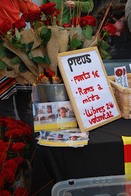 Por segundo año, Haribala tampoco se ha perdido la Diada de Sant Jordi celebrada en Mataró! Este año la parada tenía espacio para leer-disfrutar-de los libros de 2Mano. También regalaban gratis txay (típico te de la India) para todos los clientes que compraran una rosa o simplemente se quisieran sentar a ojear uno de los libros que teniamos de 2 mano, ya fuera para intercanviar o escoger alguno a cambio de la donación que quisieran. Este año como el anterior hemos podido vender todas las Rosas, así como algunos puntos de libros que Jordi, el diseñador de nuestra ong, creo para la ocasión.