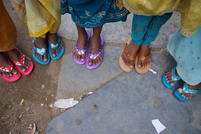 Además, se compraron zapatos para todos. A pesar de que en la India es muy común que la gente vaya descalza, en Haribala pensamos que es una medida de prevención e higiene que todos vayan calzados. Algunos de los niños llegaron al centro sin zapatos, así que un día, después de la escuela, fueron todos juntos al pueblo a comparar zapatos. Cada uno escogió el color y el modelo que preferían (hay que decir que a las niñas les costó un poco más :)). Y ya os podéis imaginar la alegría de tener unos zapatos nuevos.